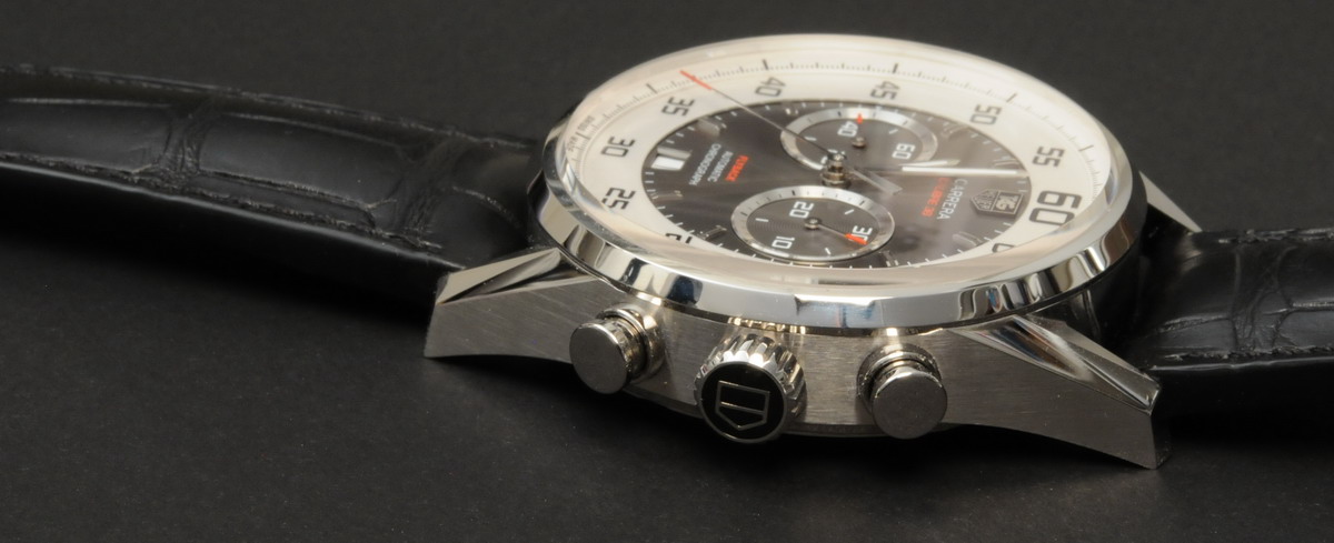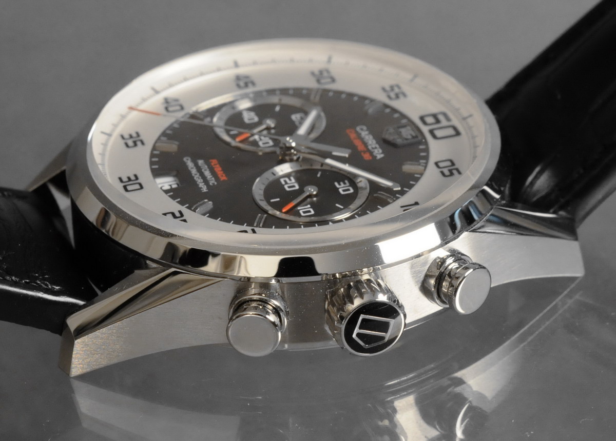 There have been hundreds of models of the Carrera over the past 50 years, with cases in a variety of shapes and configurations. The 1960s Carreras had a unique geometry, however, with the three-faceted horned lugs not used for any other watch, Heuer or non-Heuer. The Carrera Calibre 36 Flyback is true to the geometry of the original Carreras, enlarged from 36 millimeters to 43 millimeters to suit current preferences for larger chronographs.