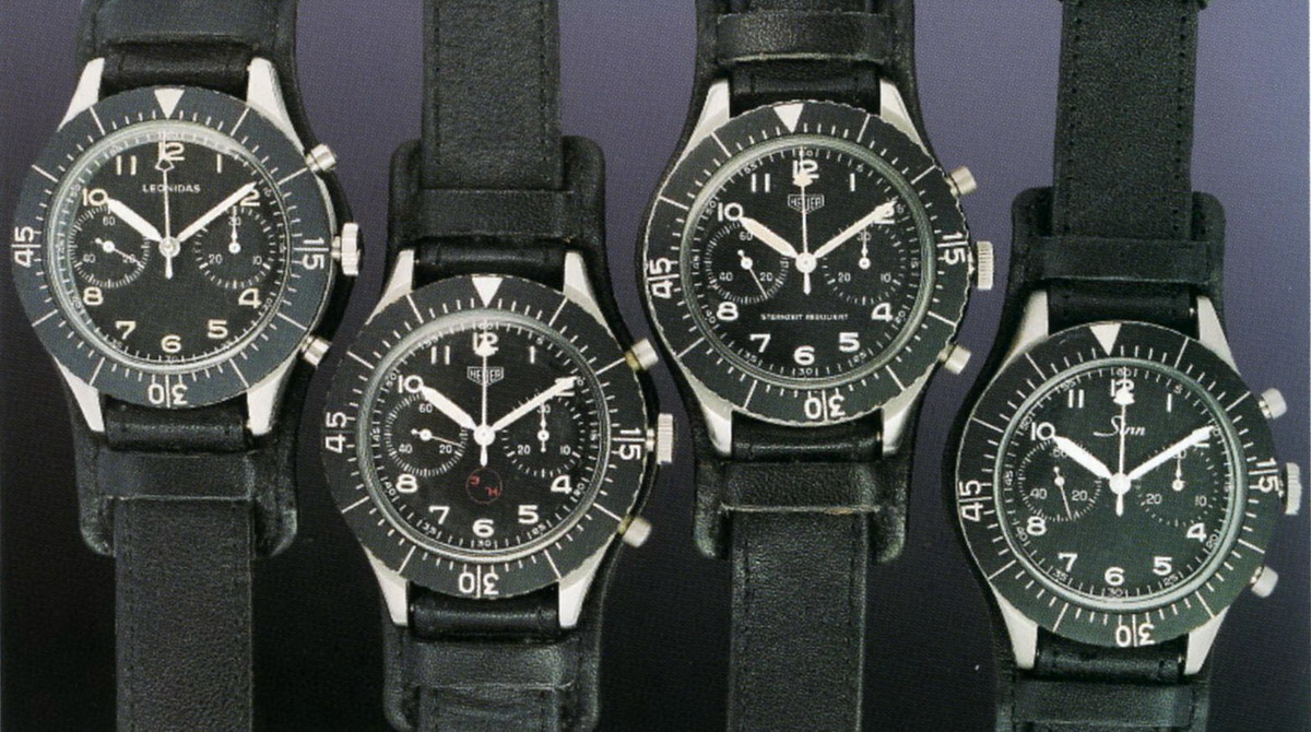 Classic flyback chronographs for military pilots have come in several generations. German air force pilots in the 1930s and 40s used flyback chronographs from Hanhart and Junghans. French air force pilots of the 1960s used the Type 20 chronograph, made by Breguet, Dodane, Viza and others. The most recognized military pilots chronograph of the 1960s was the Heuer Reference 1550 SG, supplied to the German Bundeswehr, as well as the air forces of Italy and Norway.
