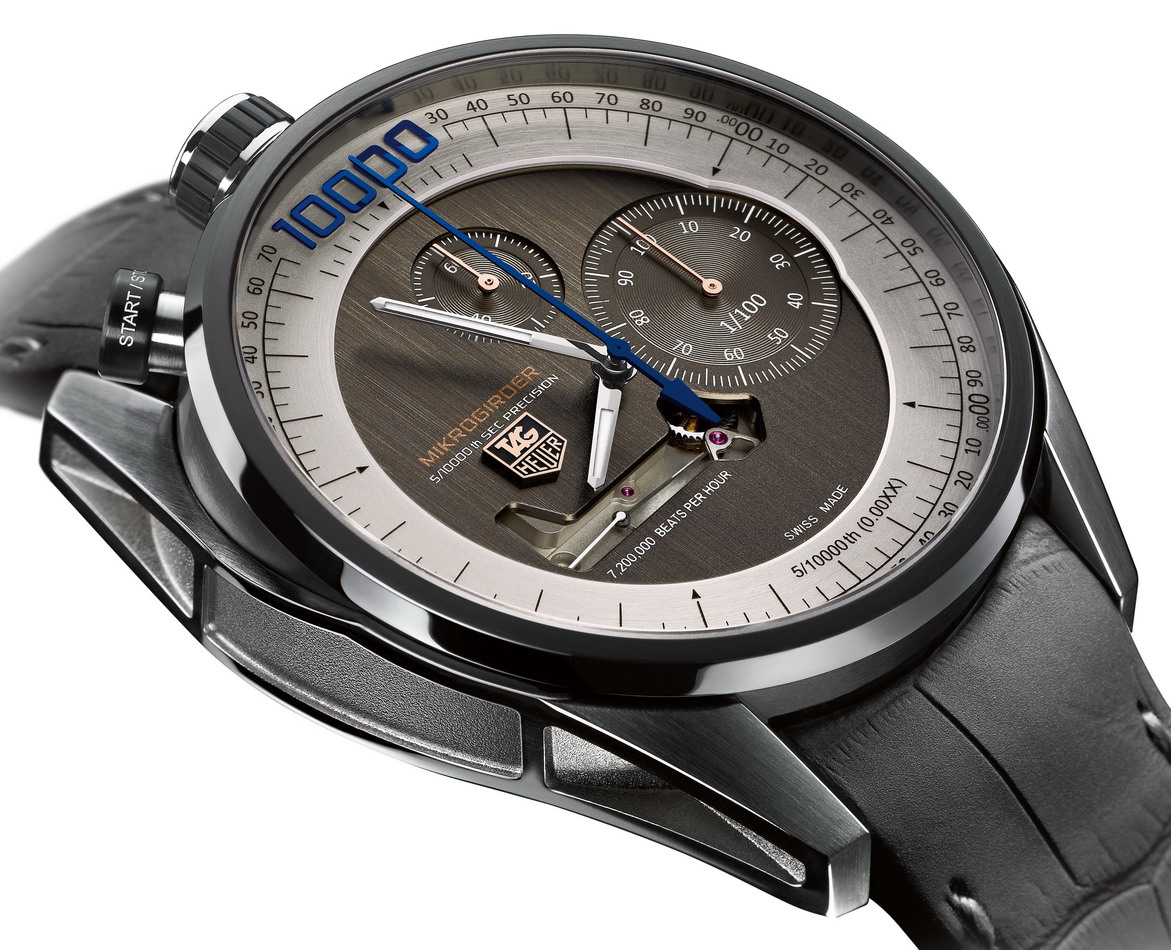 Measuring a hefty 45 millimeters, the Jack Heuer 50th Anniversary Carrera uses the same asymmetrical “bullhead” orientation and skeletonized lugs as TAG Heuer’s Mikrogirder 10,000 chronograph, shown below. (This Mikrogirder was named Swiss Watch of the Year at the November 2012 Geneva Watchmaking Grand Prix, winning the “Aiguille d’Or” award.) The asymmetry comes in the fact that the top is raised, to allow better access to the pushers.