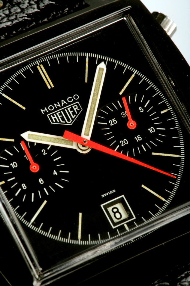 In the constellation of vintage Heuer chronographs, there are a handful of stars that shine brighter than the rest – the “Chronomatic” versions of the Autavia, Carrera and Monaco, the very first execution of the Auatvia, and – most important for purposes of this posting – the black PVD Monaco. It seems that Heuer attempted to make this final version of the Monaco in the mid-1970s, but the project was short-lived, most likely because of difficulties in getting the coating to adhere to the sharp edges of the Monaco. Few of these Black PVD Monacos were produced, and they are cherished by today’s collectors. Many collectors would rank this as the best looking of the Monaco . . . with all due respect to Mr. McQueen, of course. [These photos courtesy of Arno Haslinger]