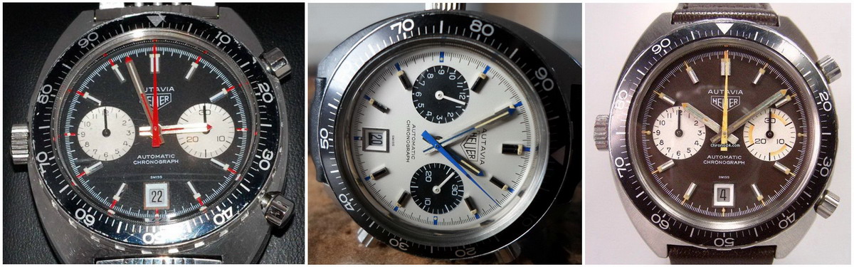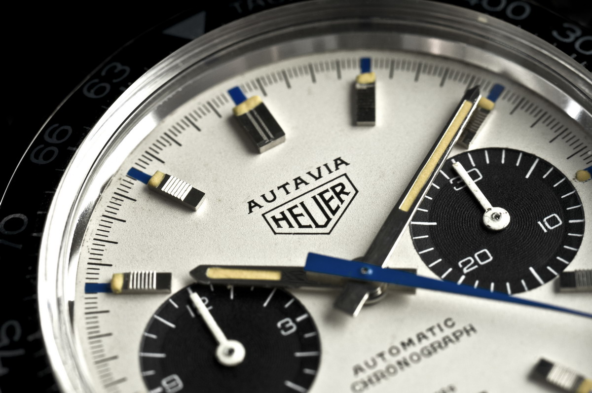 The Autavia chronograph (manual-wind) was introduced in 1962, with the first automatic Autavias being offered in 1969. There were two basic versions of the early automatic Autavias – one with a black dial (and white registers) and one with a white dial (and black registers). Collectors refer to this white-dialed model as the “Siffert”, as it was the model worn by Swiss Formula One star, Jo Siffert. As with so many of the vintage Heuers, the early models and executions of the Siffert tend to be the most valuable, with later models being produced in higher volumes and also having a higher “survival rate”. The very first model of the “Siffert” Autavia – offered in mid-1969 — is the super rare model that has “Chronomatic” on the dial. We have seen fewer than 20 of these Chronomatic models over the past decade, and they would currently sell above the $30,000 mark.